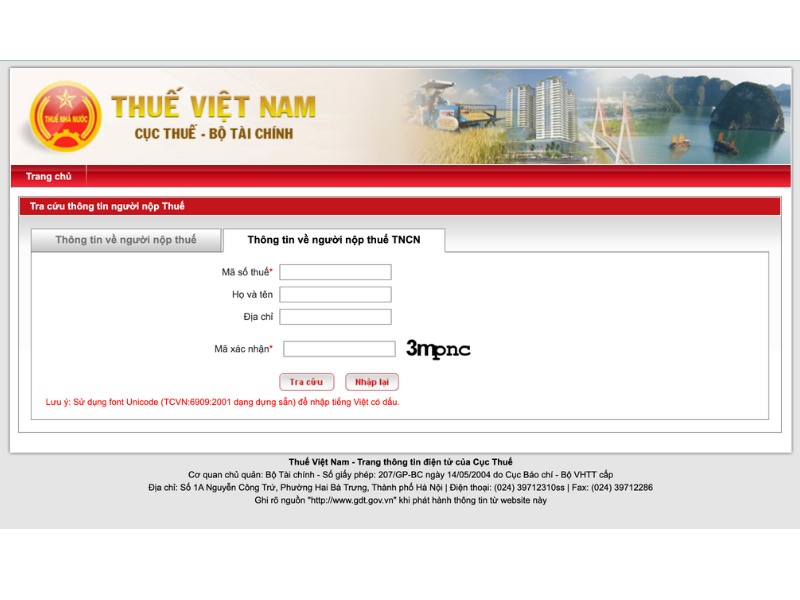 Hệ thống sẽ hiển thị biểu mẫu để bạn điền dữ liệu. Nếu là cá nhân, hãy chọn “Tra cứu thông tin người nộp thuế TNCN” hoặc truy cập trực tiếp https://tracuunnt.gdt.gov.vn/tcnnt/mstcn.jsp.